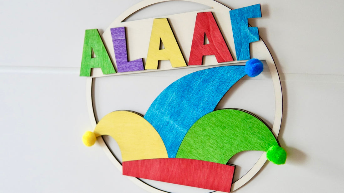 Du kannst, so wie ich, einfach den bei dir geläufigen Narren-Ausruf ebenfalls aus dem bunten Pappelsperrholz lasern und dort platzieren oder den Türkranz mit deinem Nachnamen personalisieren.