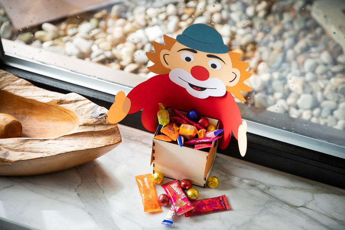 Por supuesto que puedes decorar tu hogar con adornos típicos de carnaval como simples serpentinas, confeti y globos. Pero si ya tiene la oportunidad de usar una máquina láser Mr Beam para esto, entonces debería usarla. Es por eso que hemos pensado en el diseño de la decoración de la ventana para el carnaval de este año . Al final resultó ser un payasito hecho con diferentes capas de papel, que amablemente invita a todos a compartir unos dulces con él. También puedes descargarlo desde tu tienda de diseño Mr Beam.