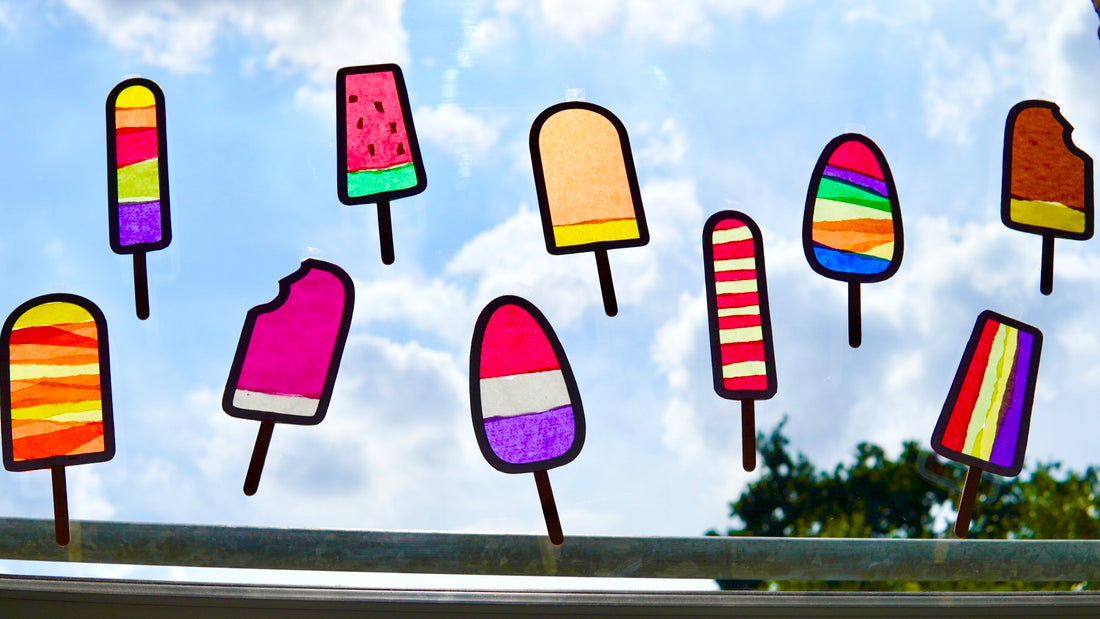 Mis hijos simplemente adhirieron nuestro atrapasol de paletas a la ventana con tiras adhesivas como decoración de ventana para el verano .