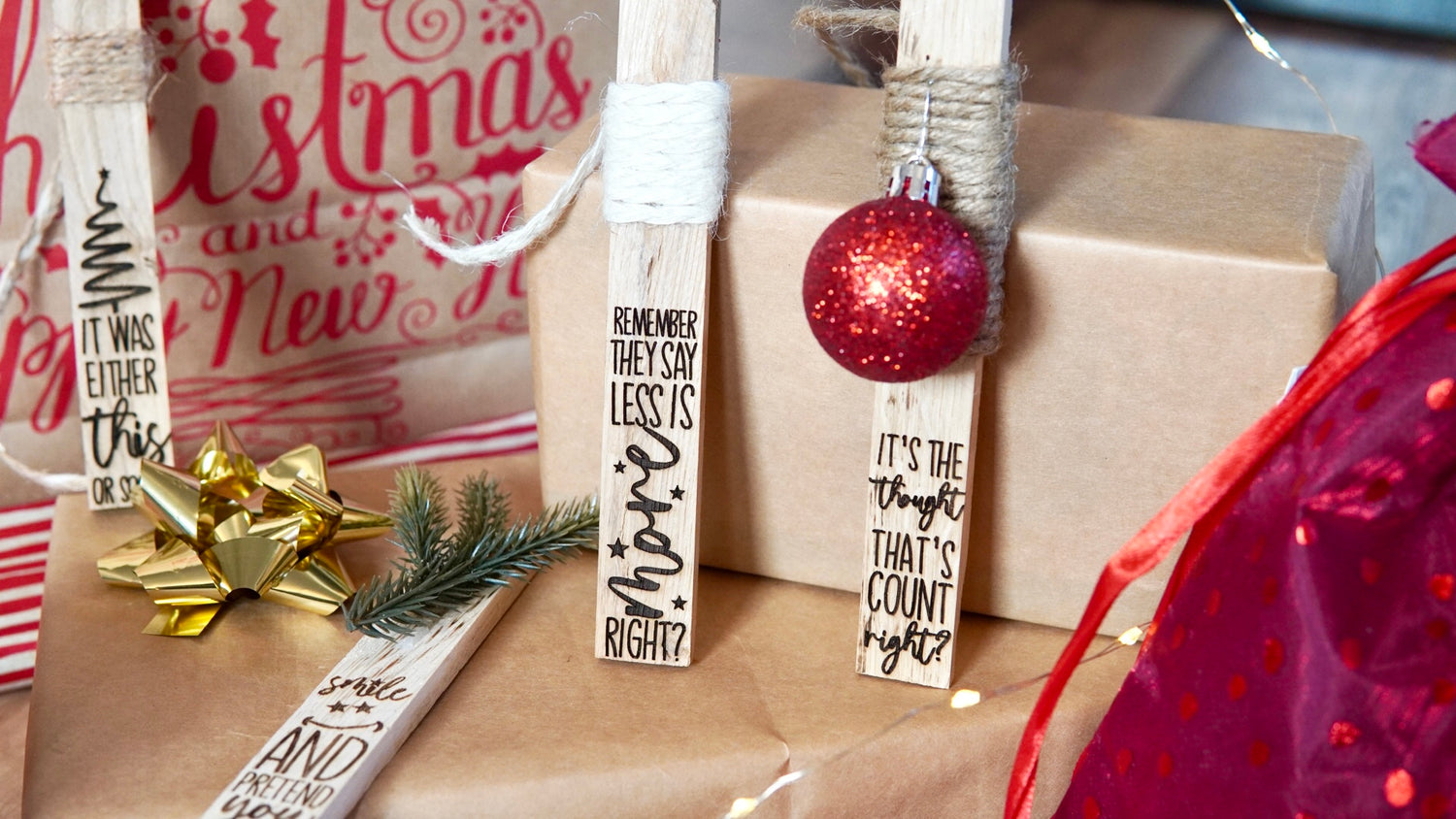 Un poco de cuerda de yute, un poco de purpurina, un poco de brillo o ramas de abeto, y sus etiquetas de regalo de madera están listas. Pero no importa lo que decidas, definitivamente necesitarás tu pistola de pegamento caliente ahora.