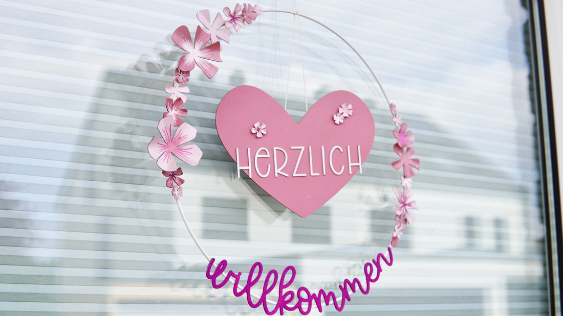 Ahora puede ajustar los elementos individuales, como la "bienvenida", el corazón y las flores, a su gusto escalándolos. Agregué un "HERZLICH" con la fuente "Niños".
