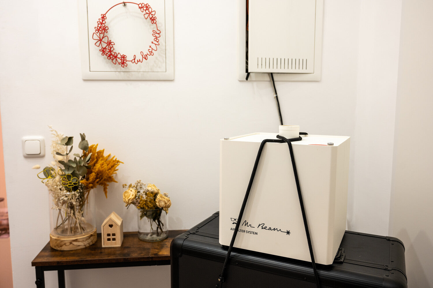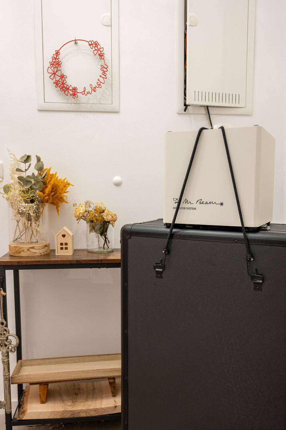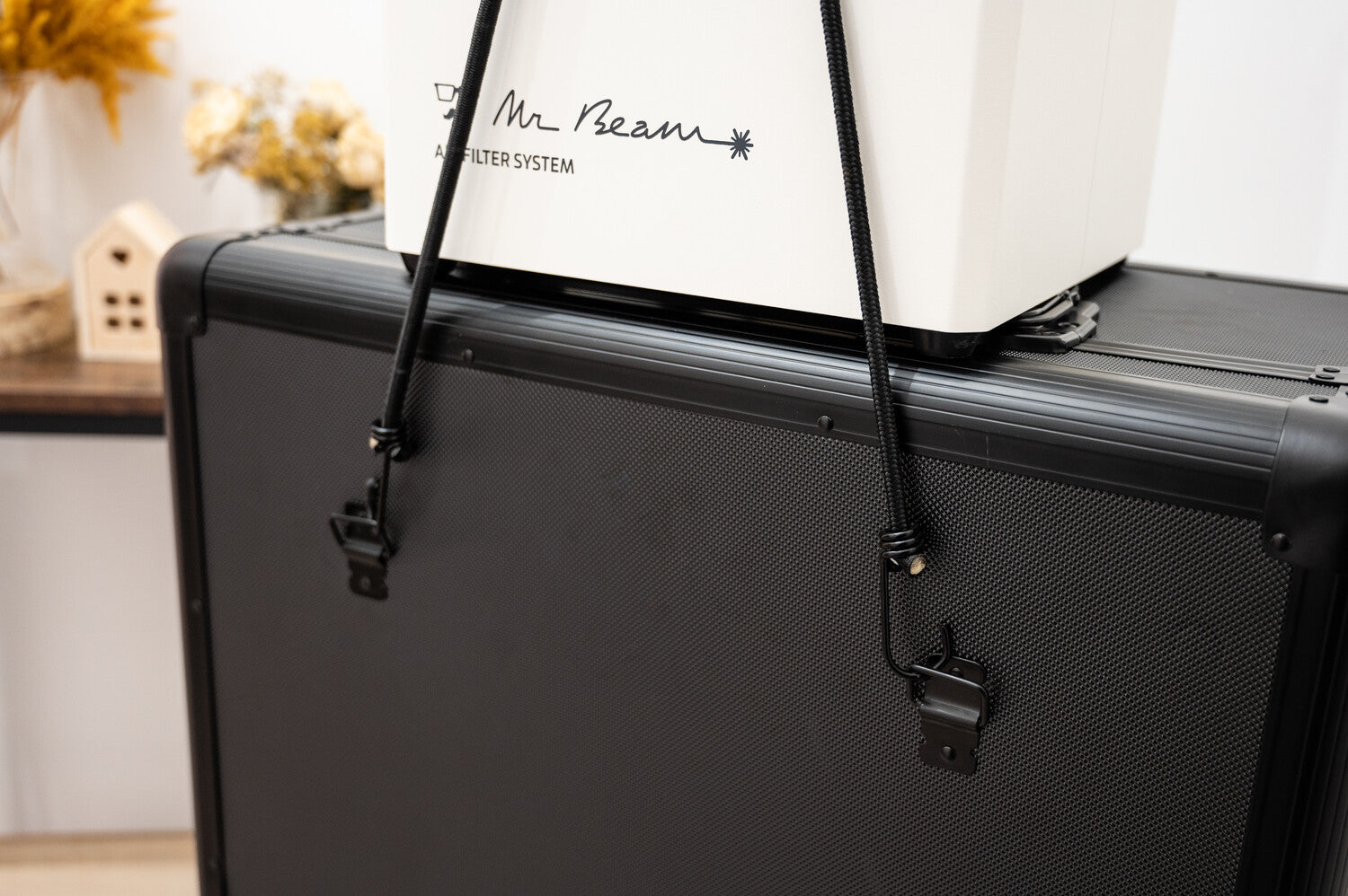 Ein weiteres Highlight: Auf dem Transportkoffer kannst du den Mr Beam Air Filter II befestigen und transportieren. Das macht den Koffer nicht nur zu einem Schutzgehäuse, sondern zu einem praktischen Begleiter für dein komplettes Lasercutter-Setup. Ideal also, wenn du mobil unterwegs bist und alles griffbereit haben möchtest.